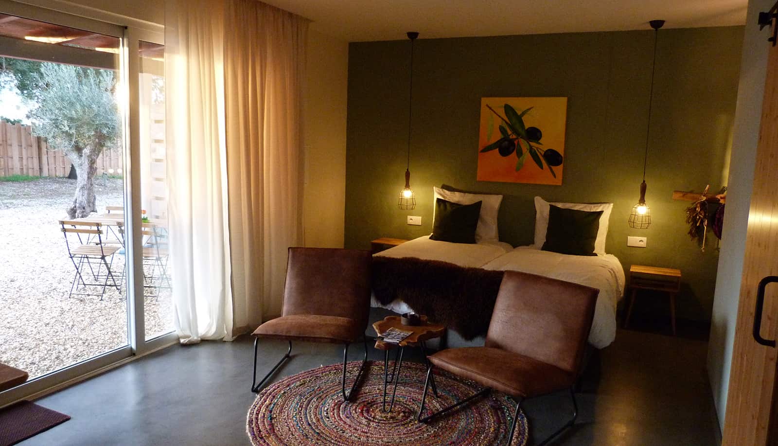 O espaçoso quarto familiar em tons de verde azeitona, com 2 quartos separados e vista para as oliveiras e um velho sobreiro que são maravilhosamente iluminados à noite. O moderno quarto tem 45 m2 no total, um espaço com camas de molas de luxo para 2 pessoas e uma área de estar atraente.