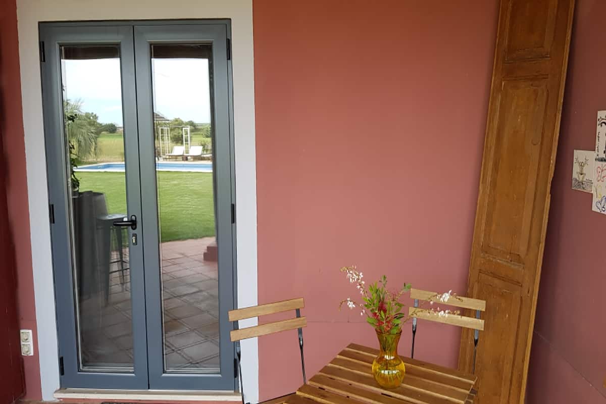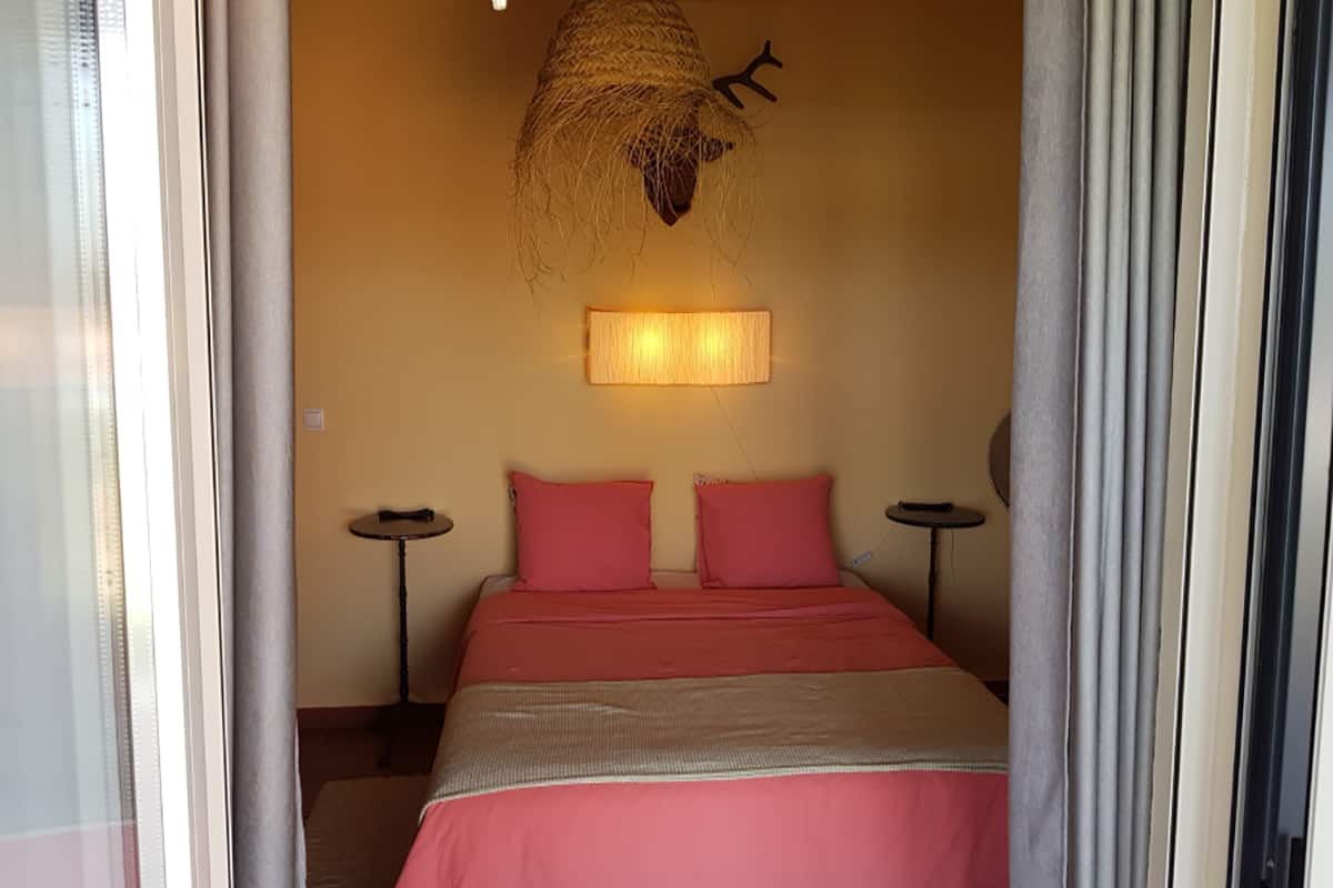 O Quarto Sol em amarelo ensolarado é o nosso menor quarto de 20m2 com cama Box Spring para 2 pessoas de 1,60 x 2,00m. O quarto tem vista para o jardim e para a piscina. É adorável acordar com o sol e depois tomar no seu próprio terraço um fantástico Pequeno-almoço a dois!